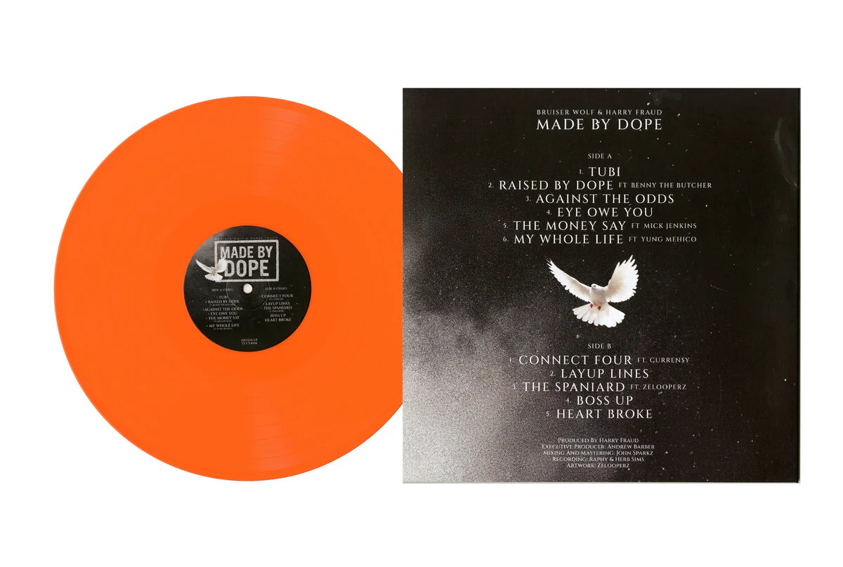 Now available on vinyl, Made By Dope is pressed for collectors and connoisseurs alike, bringing the album’s textured sonics to life in full analog warmth. From the cinematic instrumentals to Bruiser’s unmistakable voice cutting through each groove, this physical edition captures the chemistry of two distinct styles meeting at their sharpest point. A must have for fans of the Wolf, and the Wave alike.